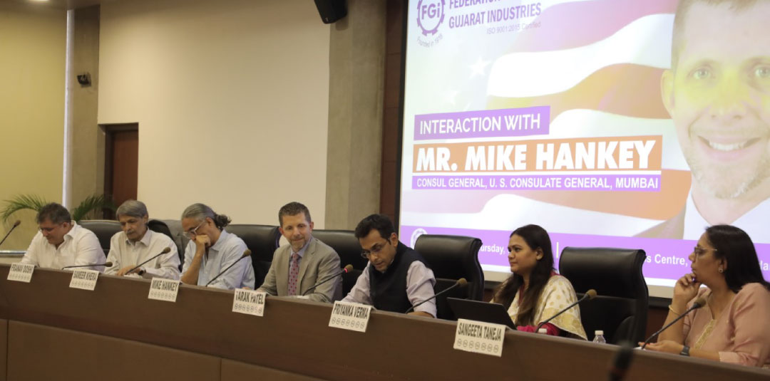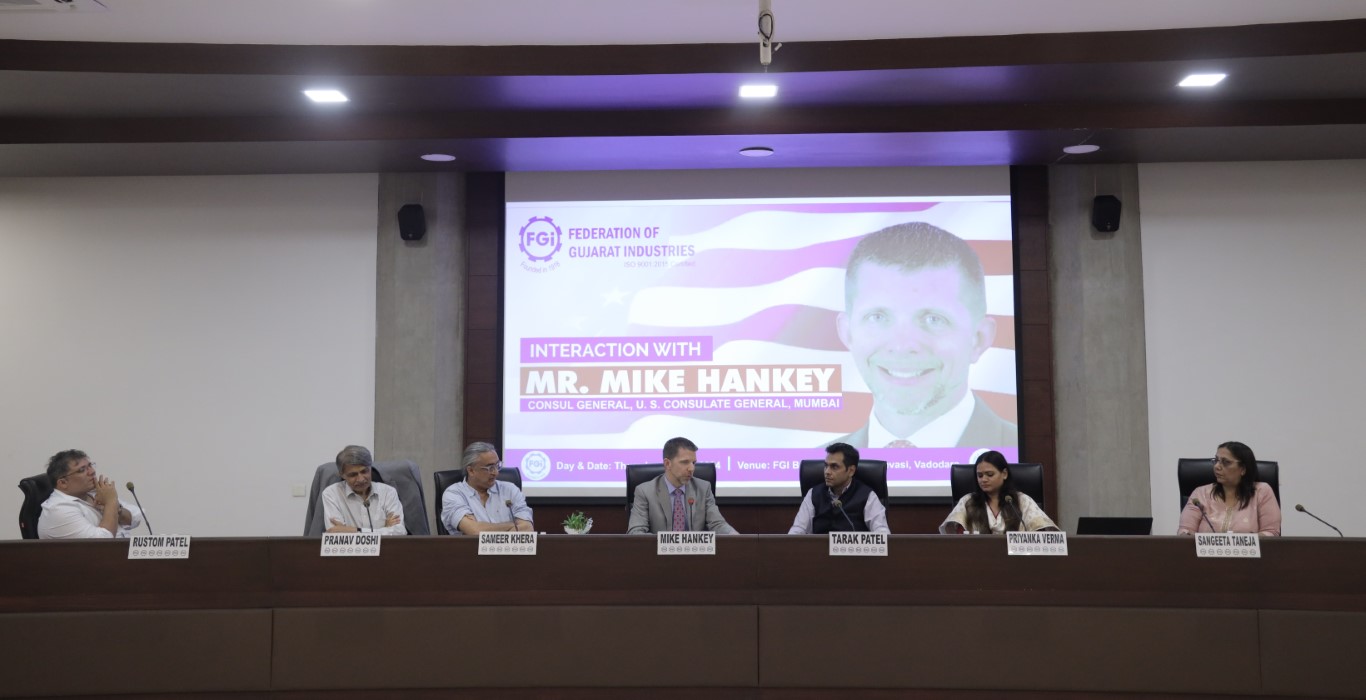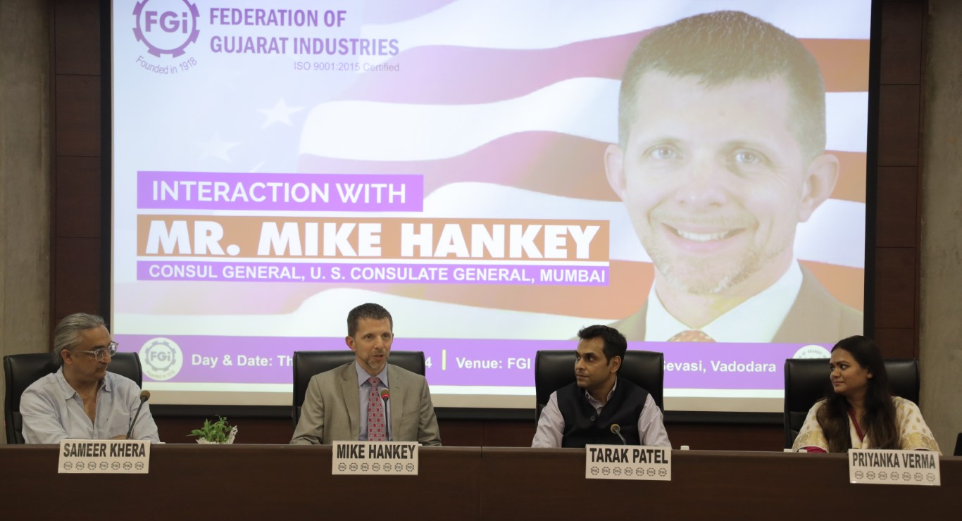 The Federation of Gujarat Industries (FGI) hosted Mr. Mike Hankey, U.S. Consul General in Mumbai, to discuss enhancing trade and investment between the U.S. and Gujarat. During the meeting, Mr. Hankey exchanged insights with FGI members on the region’s business landscape, shared experiences, and addressed potential trade barriers. He introduced the “SelectUSA Program” and highlighted the 2024 SelectUSA Investment Summit, focused on promoting foreign investment in the U.S.